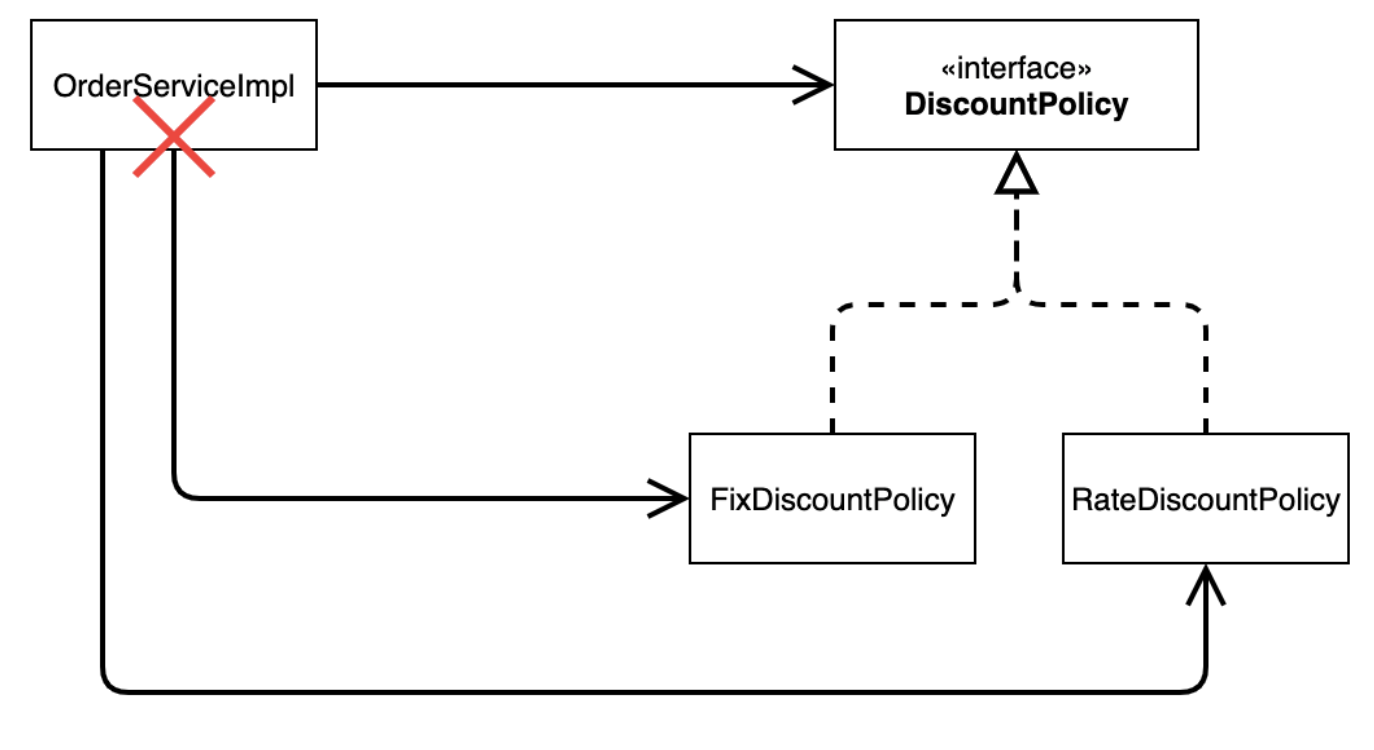 - 클라이언트 코드(OrderServiceImpl)은 DiscountPolicy의 인터페이스 뿐만 아니라 구체 클래스도 함께 의존