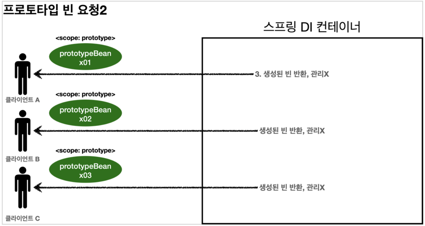 - 스프링 컨테이너는 프로토타입 빈의 생성과 의존관계 주입, 초기화 메소드까지만 관여하고 클라이언트에게 반환해 더는 관리하지 않는 매우 짧은 범위의 스코프
