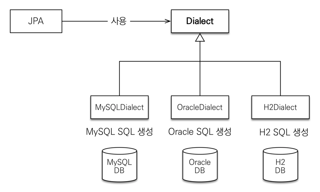 - 각각의 DB가 제공하는 SQL의 문법과 함수는 다르지만 JPA는 특정 DB에 종속하지 않는다