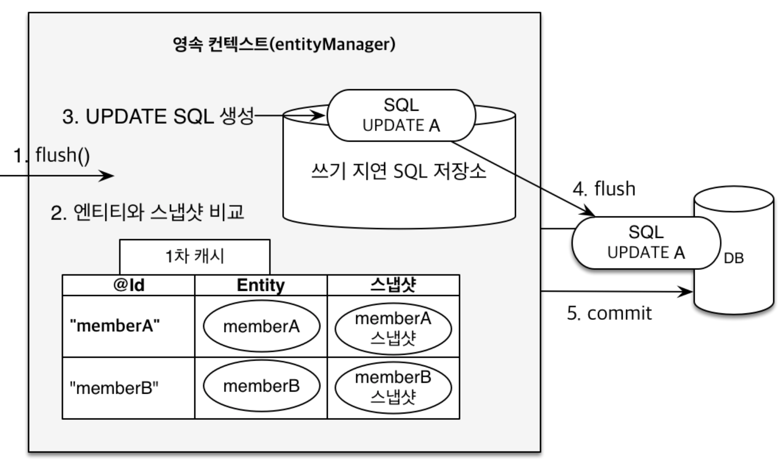 JPA는 변경을 자동으로 감지해서 update 쿼리를 쓰기 지연 저장소에 넣어두고 한 번에 쿼리를 날려 커밋을 진행한다.