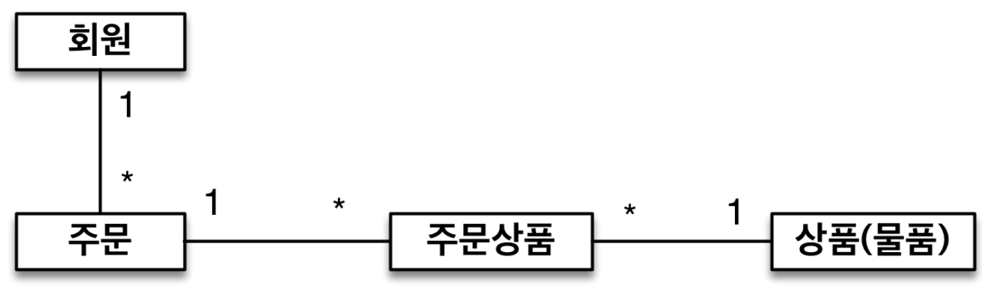 - 주문과 상품의 관계 : 주문할 때 여러 상품을 선택할 수 있다. 반대로 같은 상품도 여러 번 주문될 수있으며, 주문상품이라는 모델을 만들어서 다대가 관계를 일다대, 다대일 관계로 풀어냄