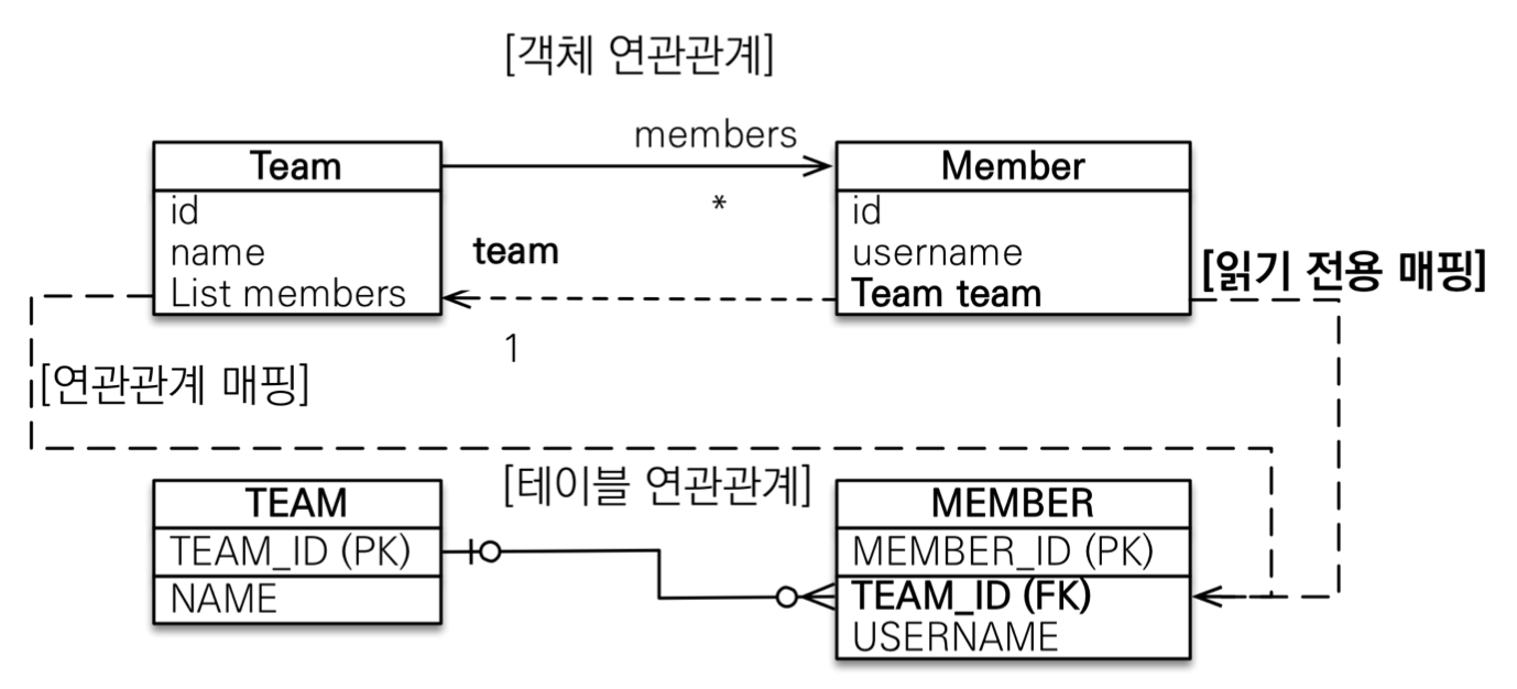 Member 클래스의 team 객체도 주인처럼 보일 수 있기 때문에 insertable, updatable에 false를 줘서 읽기 전용 매핑을 했다.