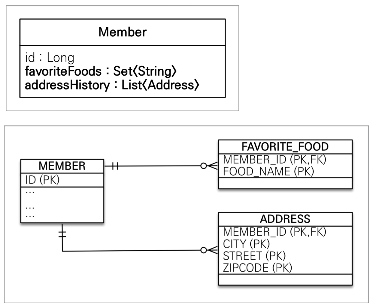 그래서 클래스 안에 컬렉션이 객체로 존재하면 별도의 테이블을 생성해 1:N 관계로 풀어내야 한다.