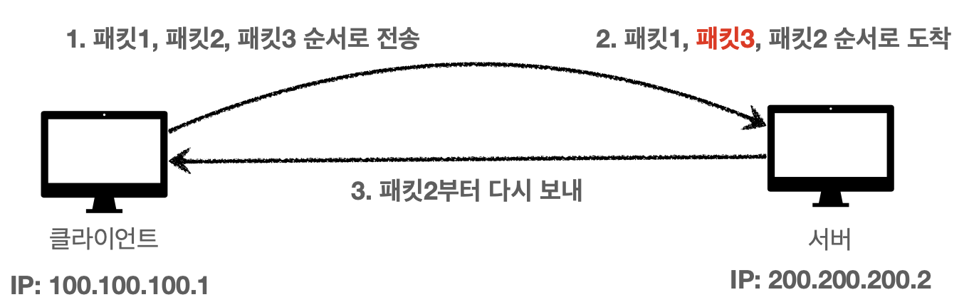 서버에서 패킷 순서를 알고 있어서 순서대로 온 패킷을 제외한 다른 패킷들을 모두 버리고 다시 보내라 요청한다.