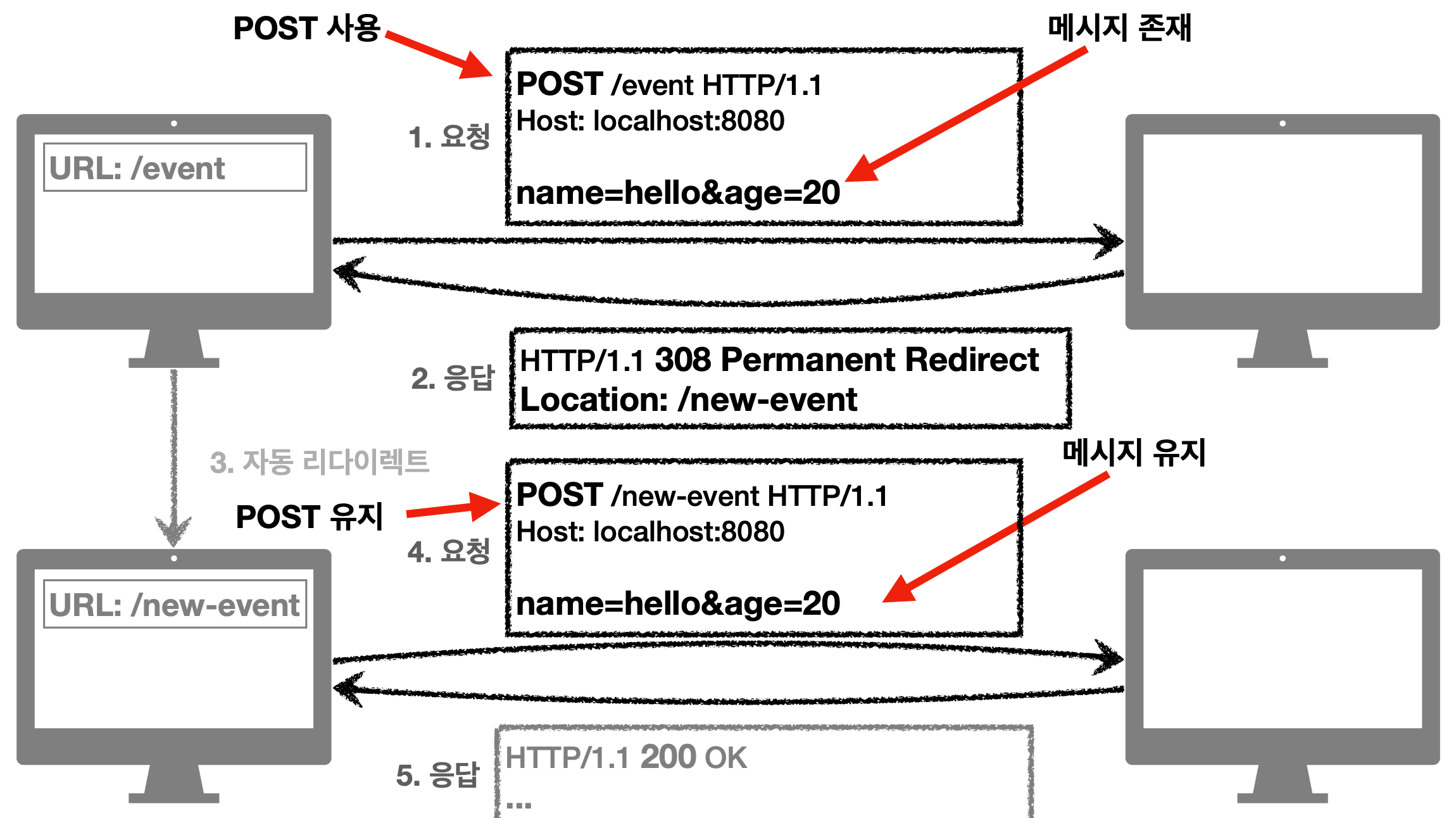 - 리다이렉트시 요청 메소드와 본문 유지(처음 POST로 보내면 리다이렉트도 POST를 유지함)