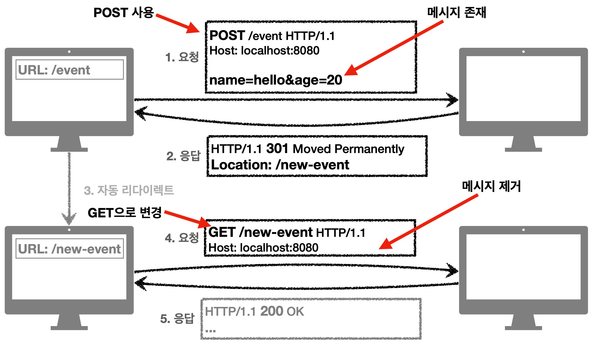 POST로 요청하고 메시지가 있지만 리다이렉션될 때는 GET으로 바뀌고 메시지도 사라진다.