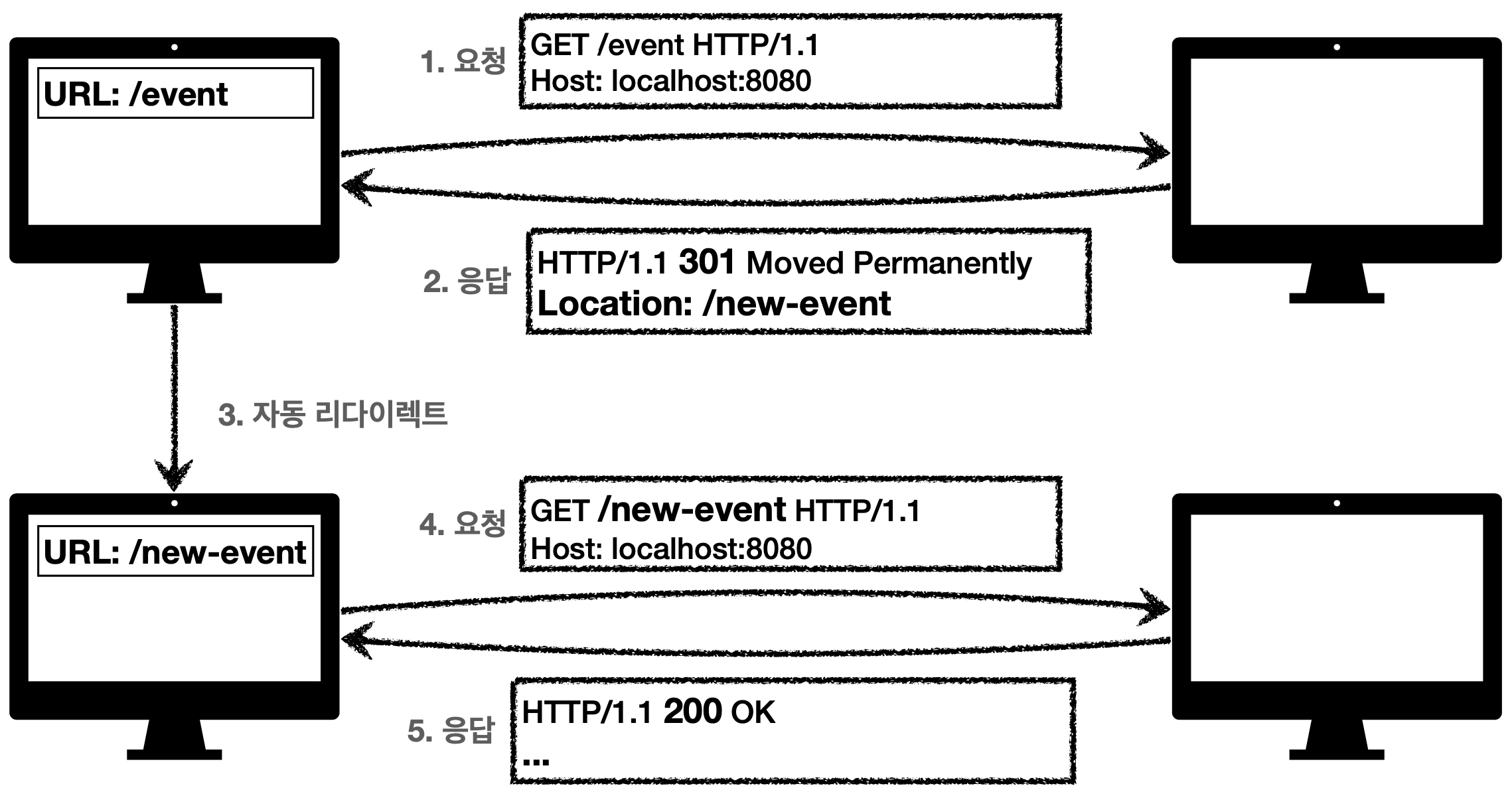 사용자들이 북마크 등을 통해서 /event를 통해 페이지를 접속할 때 클라이언트에서 서버로 GET 메소드를 통해 요청을 하면 서버는 301 Moved Permanetly와 Location: /new-event를 준다.