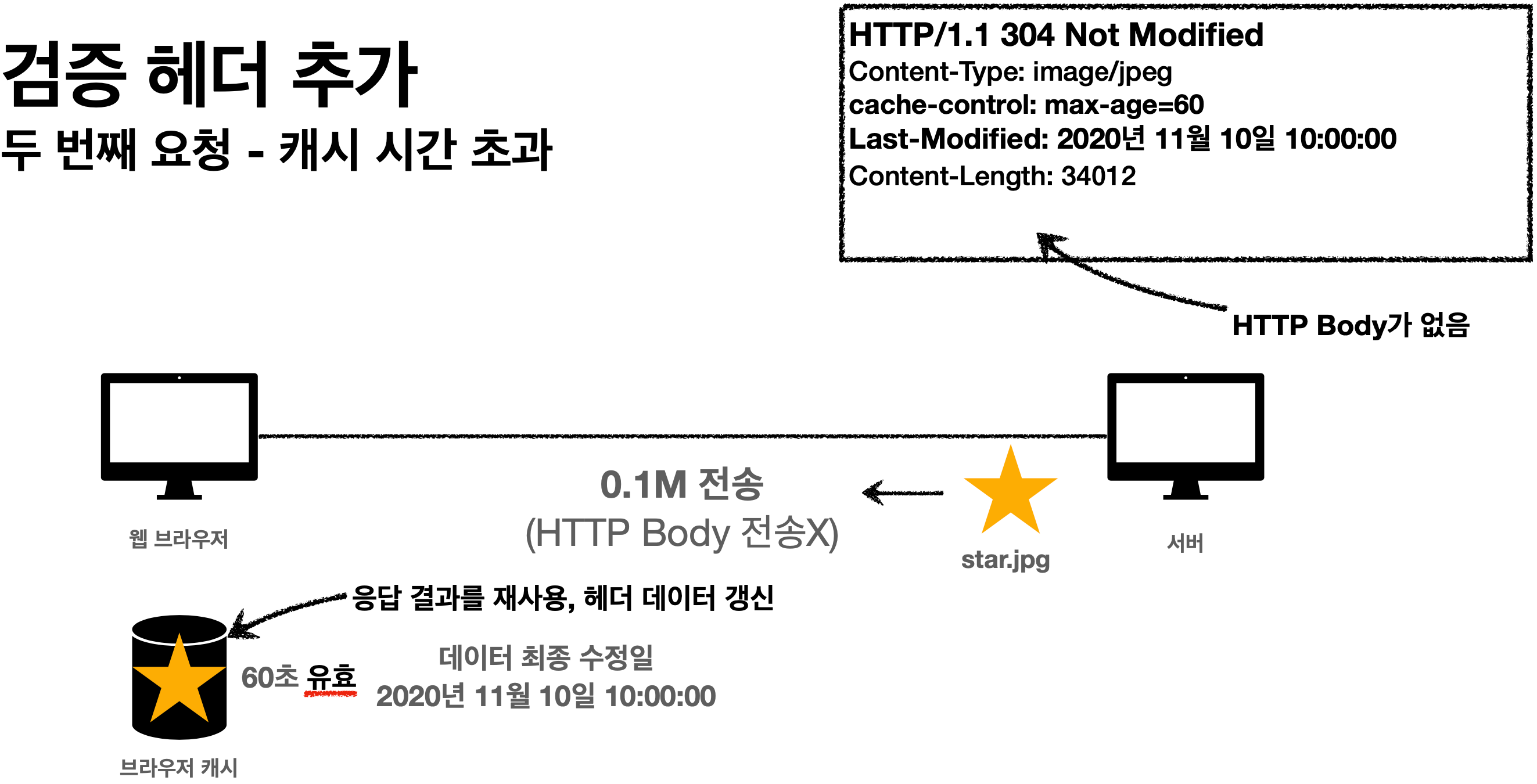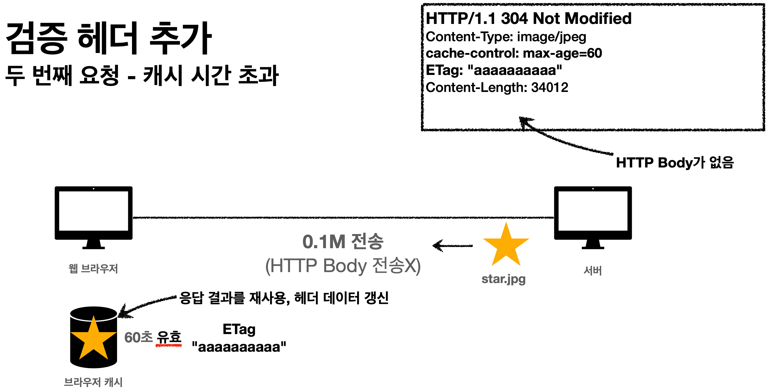 - 캐시 유효 시간이 초과해도, 서버의 데이터가 갱신되지 않으면 304 Not Modified + 헤더 메타 정보만 응답한다(바디 x)