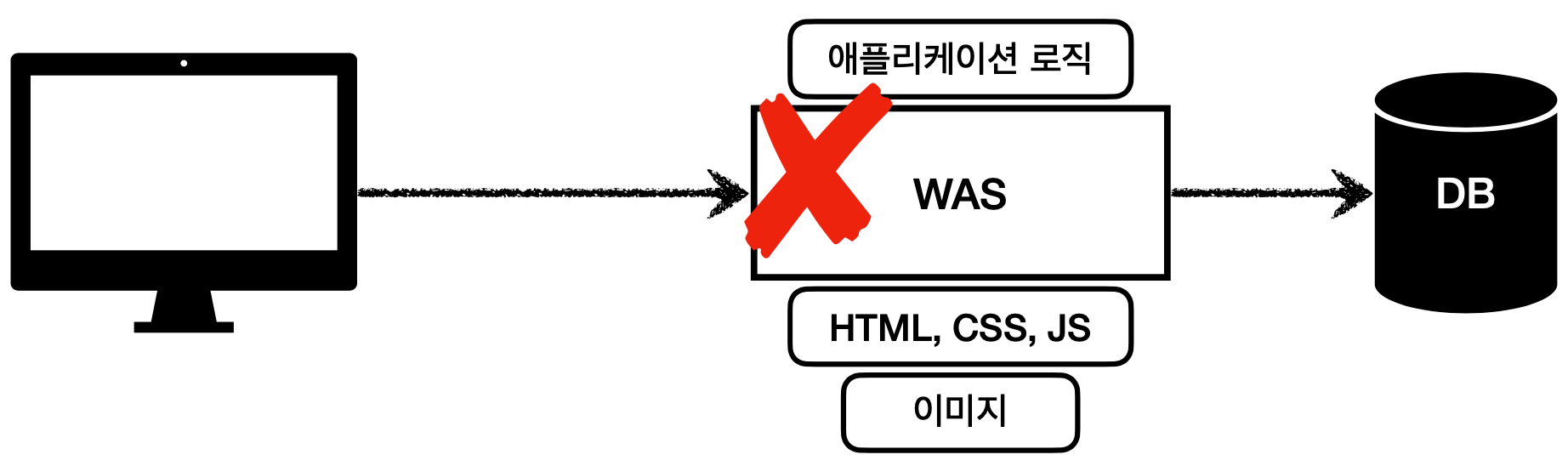 - WAS에서 과부하가 생기면 정적 리소스도 WAS에서 같이 제공하기 위해 애플리케이션 로직을 제공하지 못 할 수도 있다.
