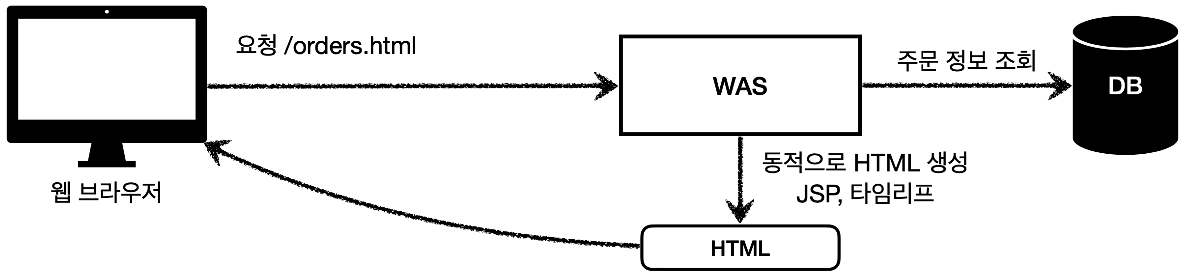 - HTMl 최종 결과를 서버에서 만들어서 웹 브라우저에 전달한다.