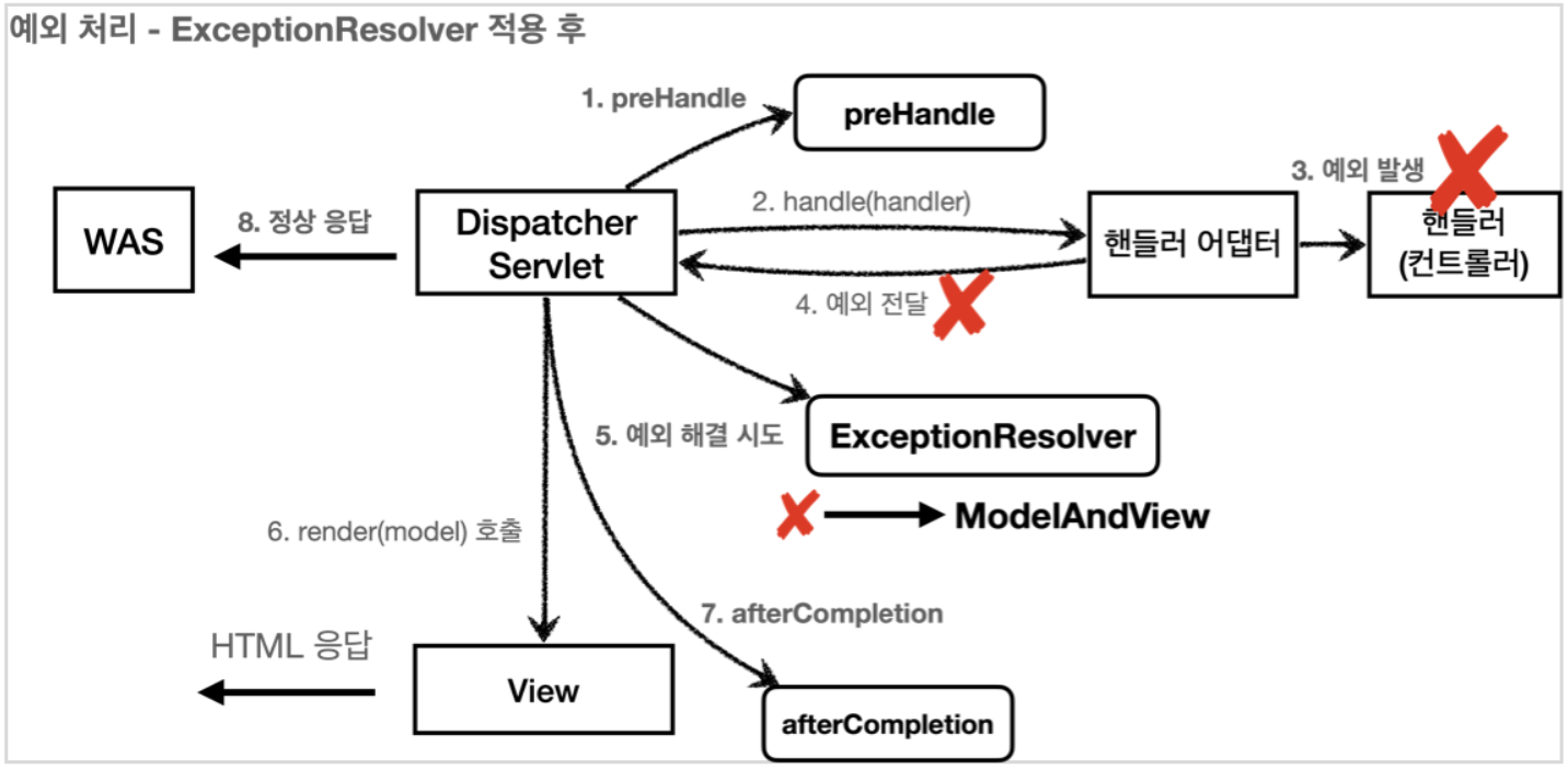 - 만약 처리할 수 있는 ExceptionResolver가 없으면 예외 처리가 안되고, 기존에 발생한 예외를 서블릿 밖으로 던진다.
