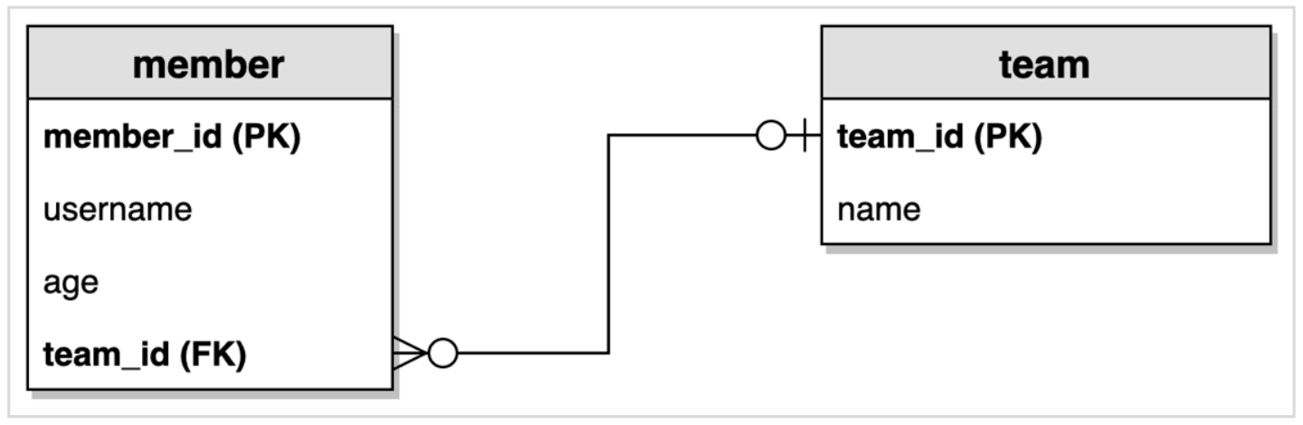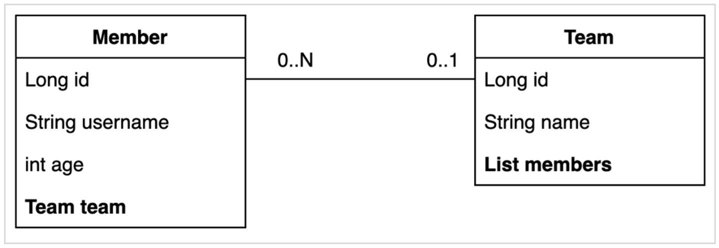 Member와 Team은 양방향 연관관계다.Member.team이 연관관계의 주인, Team.members는 연관관계의 주인이 아니기 때문에 Member.team이 데이터베이스 외래키 값을 변경, 반대편(Team.members)은 읽기만 가능하다.