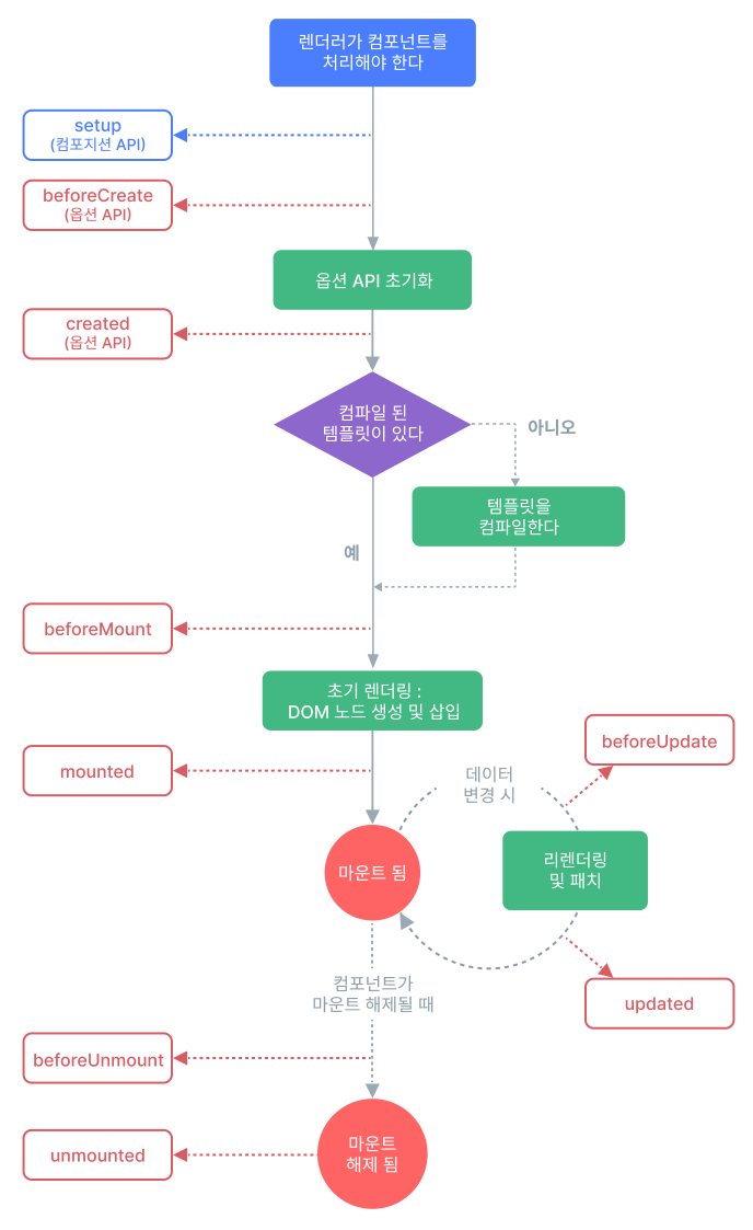 - 컴포넌트의 템플릿이 실제 DOM에 렌더링된 이후의 상태
