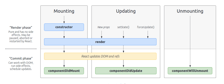 - 컴포넌트는 생성(create) -> 마운트(mount) -> 업데이트(update) -> 소멸(unmount)의 단계를 거친다.