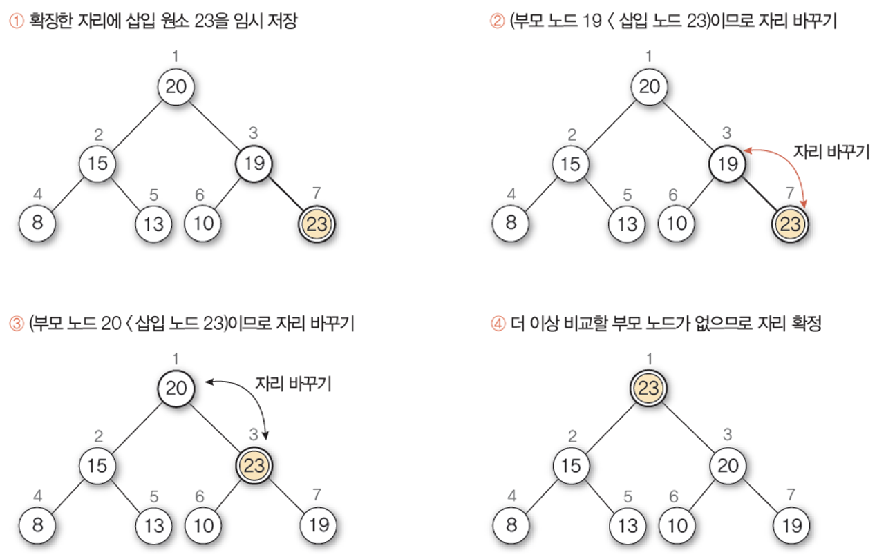 - 부모 노드와 자식 노드 중 가장 큰 값을 비교하여 자식 노드가 크면 서로 위치 교환 (큰 값을 위로 보냄)