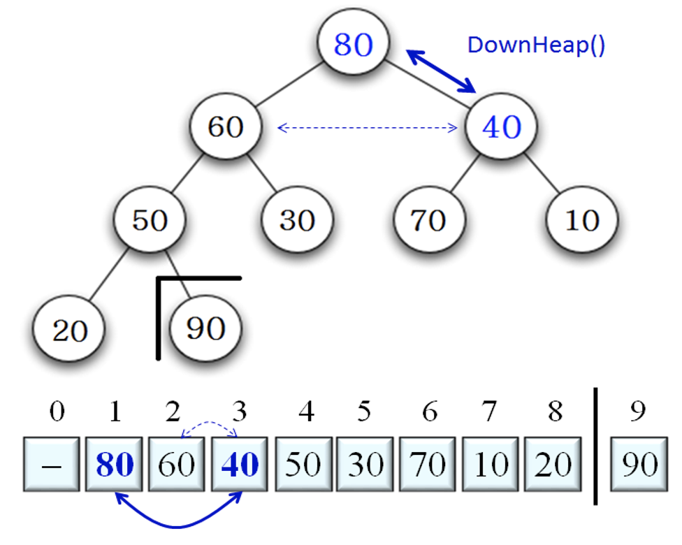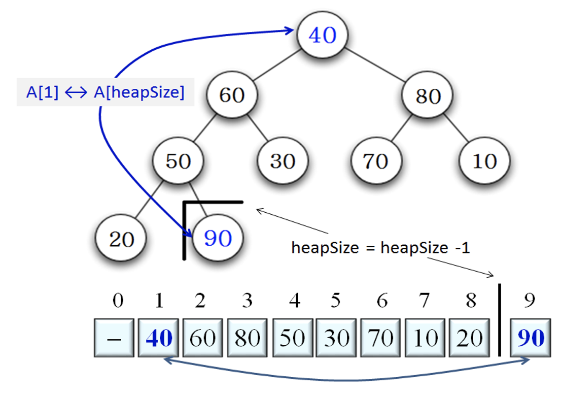 - 원래 힙의 마지막 노드 40과 루트 90을 바꿈