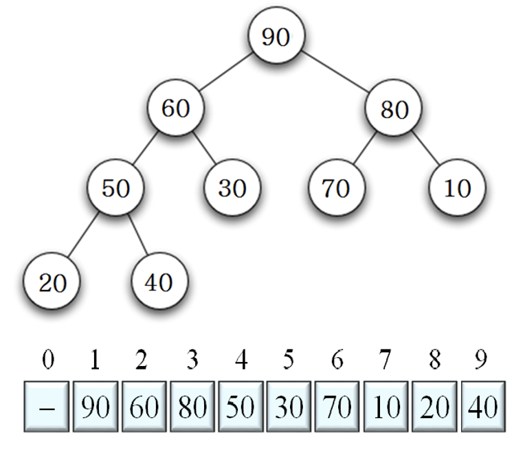 - 완전 이진 트리로, 각 노드의 키 값이 자식 노드들의 키 값보다 작지 않은 트리 로서 힙 루트는 트리 중 가장 큰 값 을 나타냄