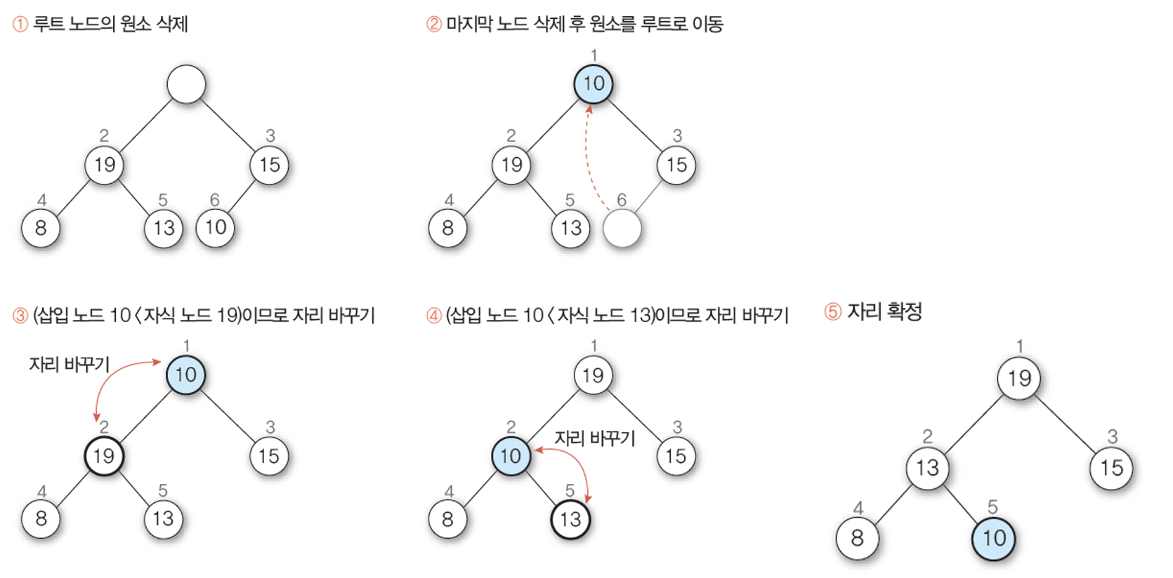 - 또 힙 조건에 위배 됐기 때문에 노드 위치를 조정 후 조건을 만족했기 때문에 확정 후 제일 마지막 노드 확정