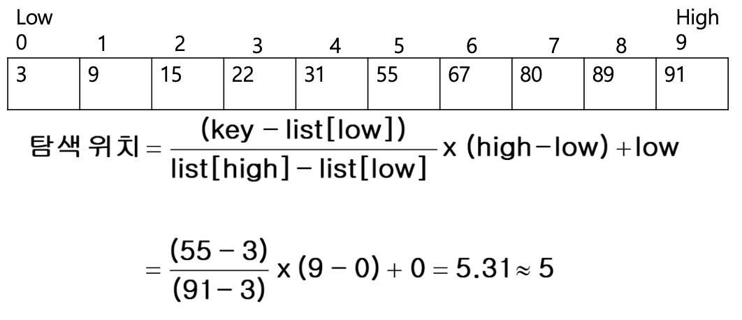 - 보간 탐색은 이진 탐색과 유사하지만 리스트를 반이 아닌 불균등하게 분할하여 탐색
